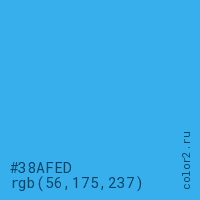 Цвет #38AFED в цветовой модели RGB обозначается тремя октетами (56, 175, 237) в десятичном формате и #38AFED в шестнадцатиричном (hex) формате, которые являются интенсивностью красного 56 (hex 38), интенсивность зелёного 175 (hex AF) и интенсивность синего 237 (hex ED).