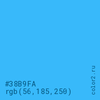 Цвет #38B9FA в цветовой модели RGB обозначается тремя октетами (56, 185, 250) в десятичном формате и #38B9FA в шестнадцатиричном (hex) формате, которые являются интенсивностью красного 56 (hex 38), интенсивность зелёного 185 (hex B9) и интенсивность синего 250 (hex FA).
