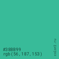 Цвет #38BB99 в цветовой модели RGB обозначается тремя октетами (56, 187, 153) в десятичном формате и #38BB99 в шестнадцатиричном (hex) формате, которые являются интенсивностью красного 56 (hex 38), интенсивность зелёного 187 (hex BB) и интенсивность синего 153 (hex 99).