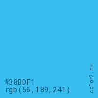 Цвет #38BDF1 в цветовой модели RGB обозначается тремя октетами (56, 189, 241) в десятичном формате и #38BDF1 в шестнадцатиричном (hex) формате, которые являются интенсивностью красного 56 (hex 38), интенсивность зелёного 189 (hex BD) и интенсивность синего 241 (hex F1).