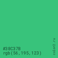 Цвет #38C37B в цветовой модели RGB обозначается тремя октетами (56, 195, 123) в десятичном формате и #38C37B в шестнадцатиричном (hex) формате, которые являются интенсивностью красного 56 (hex 38), интенсивность зелёного 195 (hex C3) и интенсивность синего 123 (hex 7B).