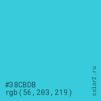 Цвет #38CBDB в цветовой модели RGB обозначается тремя октетами (56, 203, 219) в десятичном формате и #38CBDB в шестнадцатиричном (hex) формате, которые являются интенсивностью красного 56 (hex 38), интенсивность зелёного 203 (hex CB) и интенсивность синего 219 (hex DB).