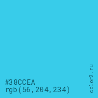 Цвет #38CCEA в цветовой модели RGB обозначается тремя октетами (56, 204, 234) в десятичном формате и #38CCEA в шестнадцатиричном (hex) формате, которые являются интенсивностью красного 56 (hex 38), интенсивность зелёного 204 (hex CC) и интенсивность синего 234 (hex EA).