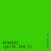 Цвет #38D002 в цветовой модели RGB обозначается тремя октетами (56, 208, 2) в десятичном формате и #38D002 в шестнадцатиричном (hex) формате, которые являются интенсивностью красного 56 (hex 38), интенсивность зелёного 208 (hex D0) и интенсивность синего 2 (hex 02).