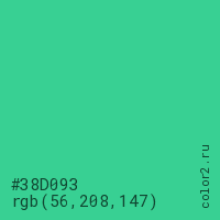 Цвет #38D093 в цветовой модели RGB обозначается тремя октетами (56, 208, 147) в десятичном формате и #38D093 в шестнадцатиричном (hex) формате, которые являются интенсивностью красного 56 (hex 38), интенсивность зелёного 208 (hex D0) и интенсивность синего 147 (hex 93).