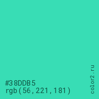 Цвет #38DDB5 в цветовой модели RGB обозначается тремя октетами (56, 221, 181) в десятичном формате и #38DDB5 в шестнадцатиричном (hex) формате, которые являются интенсивностью красного 56 (hex 38), интенсивность зелёного 221 (hex DD) и интенсивность синего 181 (hex B5).