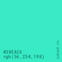 Цвет #38EAC6 в цветовой модели RGB обозначается тремя октетами (56, 234, 198) в десятичном формате и #38EAC6 в шестнадцатиричном (hex) формате, которые являются интенсивностью красного 56 (hex 38), интенсивность зелёного 234 (hex EA) и интенсивность синего 198 (hex C6).