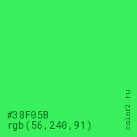 Цвет #38F05B в цветовой модели RGB обозначается тремя октетами (56, 240, 91) в десятичном формате и #38F05B в шестнадцатиричном (hex) формате, которые являются интенсивностью красного 56 (hex 38), интенсивность зелёного 240 (hex F0) и интенсивность синего 91 (hex 5B).