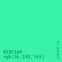 Цвет #38F2A9 в цветовой модели RGB обозначается тремя октетами (56, 242, 169) в десятичном формате и #38F2A9 в шестнадцатиричном (hex) формате, которые являются интенсивностью красного 56 (hex 38), интенсивность зелёного 242 (hex F2) и интенсивность синего 169 (hex A9).
