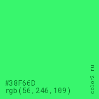 Цвет #38F66D в цветовой модели RGB обозначается тремя октетами (56, 246, 109) в десятичном формате и #38F66D в шестнадцатиричном (hex) формате, которые являются интенсивностью красного 56 (hex 38), интенсивность зелёного 246 (hex F6) и интенсивность синего 109 (hex 6D).