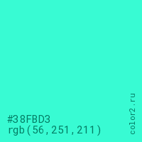 Цвет #38FBD3 в цветовой модели RGB обозначается тремя октетами (56, 251, 211) в десятичном формате и #38FBD3 в шестнадцатиричном (hex) формате, которые являются интенсивностью красного 56 (hex 38), интенсивность зелёного 251 (hex FB) и интенсивность синего 211 (hex D3).