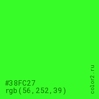 Цвет #38FC27 в цветовой модели RGB обозначается тремя октетами (56, 252, 39) в десятичном формате и #38FC27 в шестнадцатиричном (hex) формате, которые являются интенсивностью красного 56 (hex 38), интенсивность зелёного 252 (hex FC) и интенсивность синего 39 (hex 27).