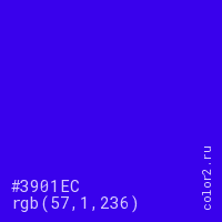 Цвет #3901EC в цветовой модели RGB обозначается тремя октетами (57, 1, 236) в десятичном формате и #3901EC в шестнадцатиричном (hex) формате, которые являются интенсивностью красного 57 (hex 39), интенсивность зелёного 1 (hex 01) и интенсивность синего 236 (hex EC).