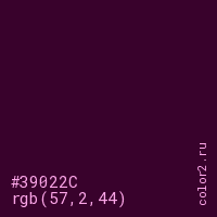 Цвет #39022C в цветовой модели RGB обозначается тремя октетами (57, 2, 44) в десятичном формате и #39022C в шестнадцатиричном (hex) формате, которые являются интенсивностью красного 57 (hex 39), интенсивность зелёного 2 (hex 02) и интенсивность синего 44 (hex 2C).