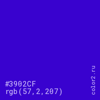 Цвет #3902CF в цветовой модели RGB обозначается тремя октетами (57, 2, 207) в десятичном формате и #3902CF в шестнадцатиричном (hex) формате, которые являются интенсивностью красного 57 (hex 39), интенсивность зелёного 2 (hex 02) и интенсивность синего 207 (hex CF).