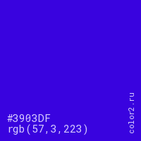 Цвет #3903DF в цветовой модели RGB обозначается тремя октетами (57, 3, 223) в десятичном формате и #3903DF в шестнадцатиричном (hex) формате, которые являются интенсивностью красного 57 (hex 39), интенсивность зелёного 3 (hex 03) и интенсивность синего 223 (hex DF).