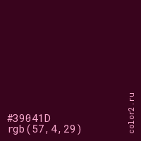 Цвет #39041D в цветовой модели RGB обозначается тремя октетами (57, 4, 29) в десятичном формате и #39041D в шестнадцатиричном (hex) формате, которые являются интенсивностью красного 57 (hex 39), интенсивность зелёного 4 (hex 04) и интенсивность синего 29 (hex 1D).