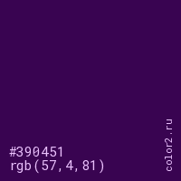 Цвет #390451 в цветовой модели RGB обозначается тремя октетами (57, 4, 81) в десятичном формате и #390451 в шестнадцатиричном (hex) формате, которые являются интенсивностью красного 57 (hex 39), интенсивность зелёного 4 (hex 04) и интенсивность синего 81 (hex 51).