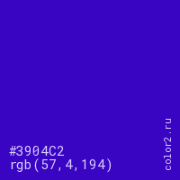Цвет #3904C2 в цветовой модели RGB обозначается тремя октетами (57, 4, 194) в десятичном формате и #3904C2 в шестнадцатиричном (hex) формате, которые являются интенсивностью красного 57 (hex 39), интенсивность зелёного 4 (hex 04) и интенсивность синего 194 (hex C2).