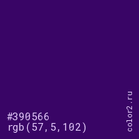 Цвет #390566 в цветовой модели RGB обозначается тремя октетами (57, 5, 102) в десятичном формате и #390566 в шестнадцатиричном (hex) формате, которые являются интенсивностью красного 57 (hex 39), интенсивность зелёного 5 (hex 05) и интенсивность синего 102 (hex 66).