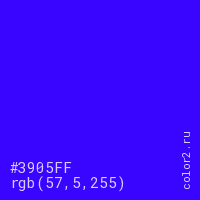 Цвет #3905FF в цветовой модели RGB обозначается тремя октетами (57, 5, 255) в десятичном формате и #3905FF в шестнадцатиричном (hex) формате, которые являются интенсивностью красного 57 (hex 39), интенсивность зелёного 5 (hex 05) и интенсивность синего 255 (hex FF).