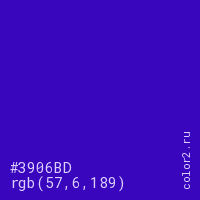Цвет #3906BD в цветовой модели RGB обозначается тремя октетами (57, 6, 189) в десятичном формате и #3906BD в шестнадцатиричном (hex) формате, которые являются интенсивностью красного 57 (hex 39), интенсивность зелёного 6 (hex 06) и интенсивность синего 189 (hex BD).