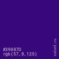 Цвет #39087D в цветовой модели RGB обозначается тремя октетами (57, 8, 125) в десятичном формате и #39087D в шестнадцатиричном (hex) формате, которые являются интенсивностью красного 57 (hex 39), интенсивность зелёного 8 (hex 08) и интенсивность синего 125 (hex 7D).