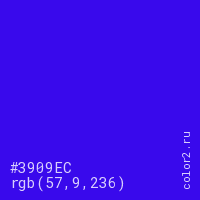 Цвет #3909EC в цветовой модели RGB обозначается тремя октетами (57, 9, 236) в десятичном формате и #3909EC в шестнадцатиричном (hex) формате, которые являются интенсивностью красного 57 (hex 39), интенсивность зелёного 9 (hex 09) и интенсивность синего 236 (hex EC).
