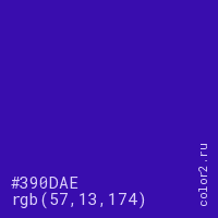 Цвет #390DAE в цветовой модели RGB обозначается тремя октетами (57, 13, 174) в десятичном формате и #390DAE в шестнадцатиричном (hex) формате, которые являются интенсивностью красного 57 (hex 39), интенсивность зелёного 13 (hex 0D) и интенсивность синего 174 (hex AE).