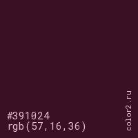 Цвет #391024 в цветовой модели RGB обозначается тремя октетами (57, 16, 36) в десятичном формате и #391024 в шестнадцатиричном (hex) формате, которые являются интенсивностью красного 57 (hex 39), интенсивность зелёного 16 (hex 10) и интенсивность синего 36 (hex 24).