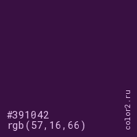 Цвет #391042 в цветовой модели RGB обозначается тремя октетами (57, 16, 66) в десятичном формате и #391042 в шестнадцатиричном (hex) формате, которые являются интенсивностью красного 57 (hex 39), интенсивность зелёного 16 (hex 10) и интенсивность синего 66 (hex 42).