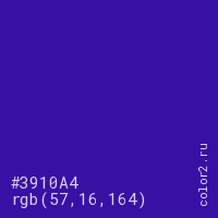 Цвет #3910A4 в цветовой модели RGB обозначается тремя октетами (57, 16, 164) в десятичном формате и #3910A4 в шестнадцатиричном (hex) формате, которые являются интенсивностью красного 57 (hex 39), интенсивность зелёного 16 (hex 10) и интенсивность синего 164 (hex A4).