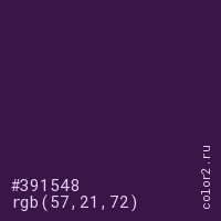 Цвет #391548 в цветовой модели RGB обозначается тремя октетами (57, 21, 72) в десятичном формате и #391548 в шестнадцатиричном (hex) формате, которые являются интенсивностью красного 57 (hex 39), интенсивность зелёного 21 (hex 15) и интенсивность синего 72 (hex 48).