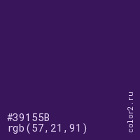 Цвет #39155B в цветовой модели RGB обозначается тремя октетами (57, 21, 91) в десятичном формате и #39155B в шестнадцатиричном (hex) формате, которые являются интенсивностью красного 57 (hex 39), интенсивность зелёного 21 (hex 15) и интенсивность синего 91 (hex 5B).