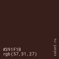 Цвет #391F1B в цветовой модели RGB обозначается тремя октетами (57, 31, 27) в десятичном формате и #391F1B в шестнадцатиричном (hex) формате, которые являются интенсивностью красного 57 (hex 39), интенсивность зелёного 31 (hex 1F) и интенсивность синего 27 (hex 1B).