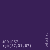 Цвет #391F57 в цветовой модели RGB обозначается тремя октетами (57, 31, 87) в десятичном формате и #391F57 в шестнадцатиричном (hex) формате, которые являются интенсивностью красного 57 (hex 39), интенсивность зелёного 31 (hex 1F) и интенсивность синего 87 (hex 57).