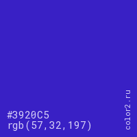 Цвет #3920C5 в цветовой модели RGB обозначается тремя октетами (57, 32, 197) в десятичном формате и #3920C5 в шестнадцатиричном (hex) формате, которые являются интенсивностью красного 57 (hex 39), интенсивность зелёного 32 (hex 20) и интенсивность синего 197 (hex C5).