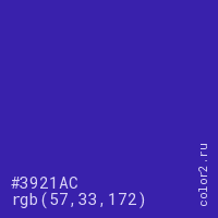 Цвет #3921AC в цветовой модели RGB обозначается тремя октетами (57, 33, 172) в десятичном формате и #3921AC в шестнадцатиричном (hex) формате, которые являются интенсивностью красного 57 (hex 39), интенсивность зелёного 33 (hex 21) и интенсивность синего 172 (hex AC).
