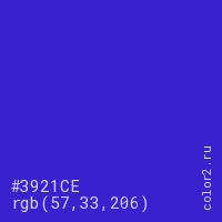 Цвет #3921CE в цветовой модели RGB обозначается тремя октетами (57, 33, 206) в десятичном формате и #3921CE в шестнадцатиричном (hex) формате, которые являются интенсивностью красного 57 (hex 39), интенсивность зелёного 33 (hex 21) и интенсивность синего 206 (hex CE).