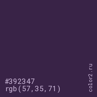 Цвет #392347 в цветовой модели RGB обозначается тремя октетами (57, 35, 71) в десятичном формате и #392347 в шестнадцатиричном (hex) формате, которые являются интенсивностью красного 57 (hex 39), интенсивность зелёного 35 (hex 23) и интенсивность синего 71 (hex 47).