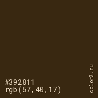 Цвет #392811 в цветовой модели RGB обозначается тремя октетами (57, 40, 17) в десятичном формате и #392811 в шестнадцатиричном (hex) формате, которые являются интенсивностью красного 57 (hex 39), интенсивность зелёного 40 (hex 28) и интенсивность синего 17 (hex 11).