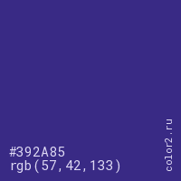 Цвет #392A85 в цветовой модели RGB обозначается тремя октетами (57, 42, 133) в десятичном формате и #392A85 в шестнадцатиричном (hex) формате, которые являются интенсивностью красного 57 (hex 39), интенсивность зелёного 42 (hex 2A) и интенсивность синего 133 (hex 85).