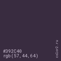 Цвет #392C40 в цветовой модели RGB обозначается тремя октетами (57, 44, 64) в десятичном формате и #392C40 в шестнадцатиричном (hex) формате, которые являются интенсивностью красного 57 (hex 39), интенсивность зелёного 44 (hex 2C) и интенсивность синего 64 (hex 40).