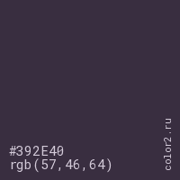 Цвет #392E40 в цветовой модели RGB обозначается тремя октетами (57, 46, 64) в десятичном формате и #392E40 в шестнадцатиричном (hex) формате, которые являются интенсивностью красного 57 (hex 39), интенсивность зелёного 46 (hex 2E) и интенсивность синего 64 (hex 40).