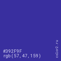 Цвет #392F9F в цветовой модели RGB обозначается тремя октетами (57, 47, 159) в десятичном формате и #392F9F в шестнадцатиричном (hex) формате, которые являются интенсивностью красного 57 (hex 39), интенсивность зелёного 47 (hex 2F) и интенсивность синего 159 (hex 9F).