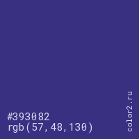 Цвет #393082 в цветовой модели RGB обозначается тремя октетами (57, 48, 130) в десятичном формате и #393082 в шестнадцатиричном (hex) формате, которые являются интенсивностью красного 57 (hex 39), интенсивность зелёного 48 (hex 30) и интенсивность синего 130 (hex 82).