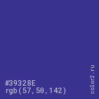 Цвет #39328E в цветовой модели RGB обозначается тремя октетами (57, 50, 142) в десятичном формате и #39328E в шестнадцатиричном (hex) формате, которые являются интенсивностью красного 57 (hex 39), интенсивность зелёного 50 (hex 32) и интенсивность синего 142 (hex 8E).