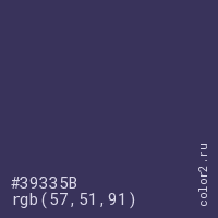 Цвет #39335B в цветовой модели RGB обозначается тремя октетами (57, 51, 91) в десятичном формате и #39335B в шестнадцатиричном (hex) формате, которые являются интенсивностью красного 57 (hex 39), интенсивность зелёного 51 (hex 33) и интенсивность синего 91 (hex 5B).