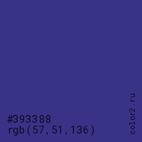 Цвет #393388 в цветовой модели RGB обозначается тремя октетами (57, 51, 136) в десятичном формате и #393388 в шестнадцатиричном (hex) формате, которые являются интенсивностью красного 57 (hex 39), интенсивность зелёного 51 (hex 33) и интенсивность синего 136 (hex 88).