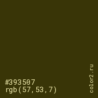 Цвет #393507 в цветовой модели RGB обозначается тремя октетами (57, 53, 7) в десятичном формате и #393507 в шестнадцатиричном (hex) формате, которые являются интенсивностью красного 57 (hex 39), интенсивность зелёного 53 (hex 35) и интенсивность синего 7 (hex 07).